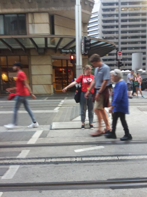 | Marshalls guide walkers around camouflaged trip hazard installed in the middle of a pedestrian crossing at Curtain Place on George Street. |